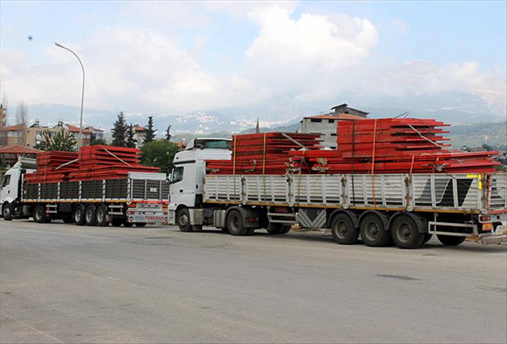 Hatay'ın Yayladağı ilçesine gelen tırlara yüklü konteyner parçaları, Suriye'ye gönderilmek üzere insani yardımların geçişi için açılan Arfalı noktasına götürüldü.