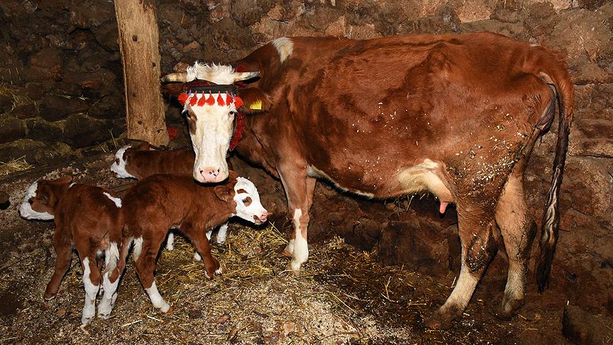 Gümüşhane'de 9 ay önce suni tohumlama yapılan "Yaşmaklı" adındaki simental cinsi inek, üçüncü doğumunda 3 buzağı birden dünyaya getirdi.