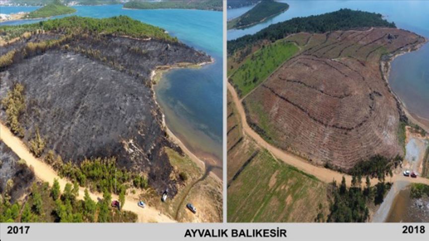 Balıkesir'in Ayvalık, İzmir'in Foça ilçesi ve Meryemana bölgesi ile Antalya'nın Taşağıl bölgesinde yanan ormanlık alanlar, yürütülen ağaçlandırma çalışmalarıyla "yeşil dönüşüm" sürecine girdi.