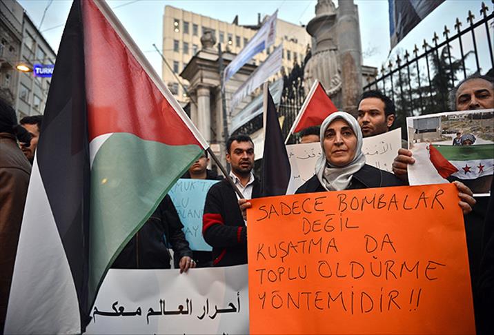 Galatasaray Lisesi önünde toplanan Filistinli ve Suriyeli bir grup, "Elyarmuk kampında açlık şehidi olan 58 kişiyi tarih unutmayacak", "Filistinli mültecileri kim koruyacak", "Elyarmuk kampında uygulanan ablukaya son verilsin" pankartları açtı.