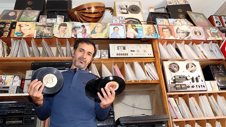 Arşivinde 2 bin plak ve makara bant ile 10 pikap ve makara teybi bulunan Ay, koleksiyonunu babasına ait apartman dairesinin müzeyi andıran odasında sergiliyor.