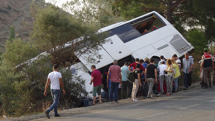 Yol kenarındaki zeytin ağacına takılan otobüs, son anda şarampole devrilmekten kurtuldu.