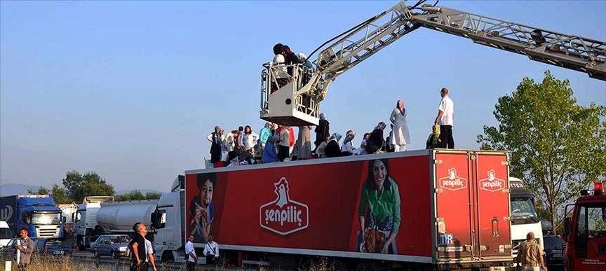 Yolcular, yangın tehlikesine karşı otobüsteki havalandırma kapağı kırılarak tahliye edildi. Otobüsün üzerine çıkarak, bitişikte bekleyen tırın üzerine geçen yolcular, itfaiye ekiplerinin yardımıyla araçtan indirildi.