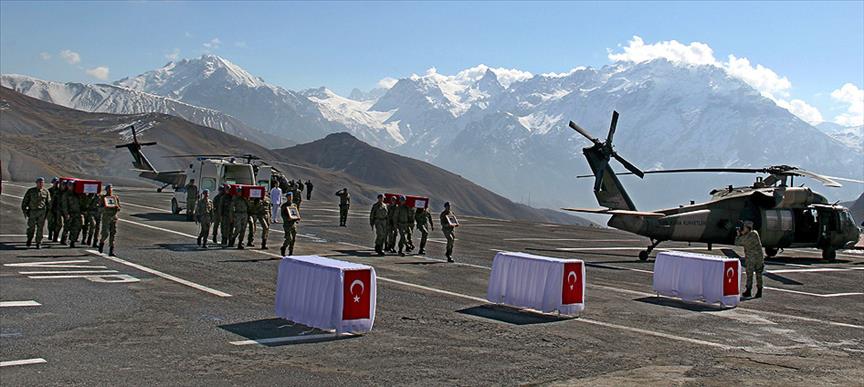 Helikopterle Hakkari Dağ ve Komando Tugay Komutanlığı'na getirilen şehitler için burada tören düzenlendi. Şehitlerin Türk bayrağına sarılı tabutları, silah arkadaşlarının omuzlarında tören alanına getirildi.