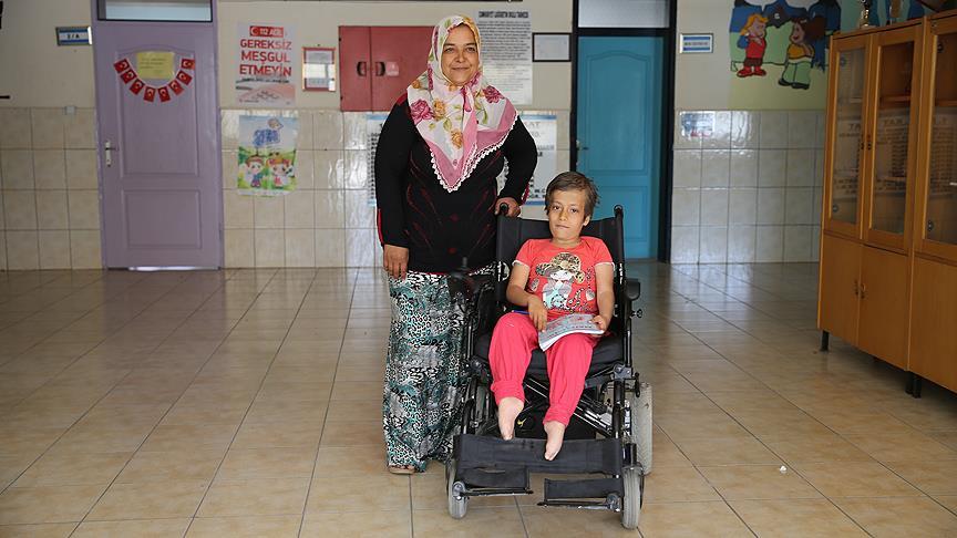 Annesi tarafından uzun süre kucakta okula getirilip götürülen 11 yaşındaki Çelik, 10 gün önce ödünç olarak verilen tekerlekli sandalyeyle okuluna devam etti.