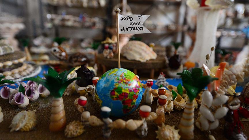 Antalya'da çocuk yaşından bu yana sahillerden topladığı deniz kabuklarından tasarımlar oluşturan Mutlu Deniz, EXPO 2016 Antalya sergi alanının minyatürünü deniz kabuklarından yaptı.