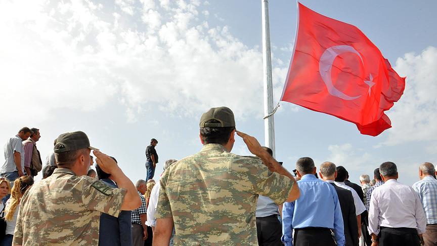 Konuşmaların ardından, direk üzerine çelik halatla bağlı 12 metrekarelik Türk bayrağı, İstiklal Marşı eşliğinde göndere çekildi.