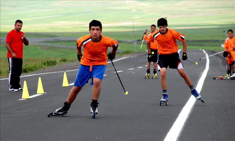Kış turizminin önemli kayak merkezlerinden biri olan Sarıkamış'ta, sporcular kış sezonunda 6 ay kar üzerinde kayak yaptıktan sonra, yazın da asfalt üzerinde tekerlekli kayaklarla antrenmanlarını sürdürüyor.