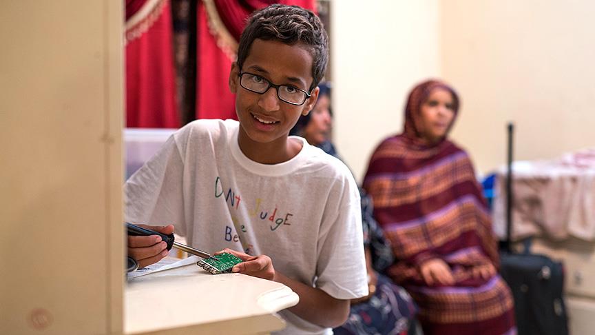 ABD'nin Teksas eyaletinde kendi icadı olan saati öğretmenine göstermek için götürdüğü okulda polisler tarafından kelepçelenerek gözaltına alınan 14 yaşındaki Müslüman öğrenci Ahmed Muhammed, "Gözaltına alındığımda korkmuştum ama dünyanın dört bir yanından gelen destek mesajları sayesinde artık korkmuyorum. Aslında onların benden korktuğunu hissediyorum" dedi.