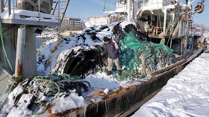 Tekirdağ'da sıcaklığın sıfırın altında 12 dereceye kadar düşmesi nedeniyle teknelerinin bazı aksamları ve ağları buz tutan balıkçılar, denize açılabilmek için havanın düzelmesini bekliyor.