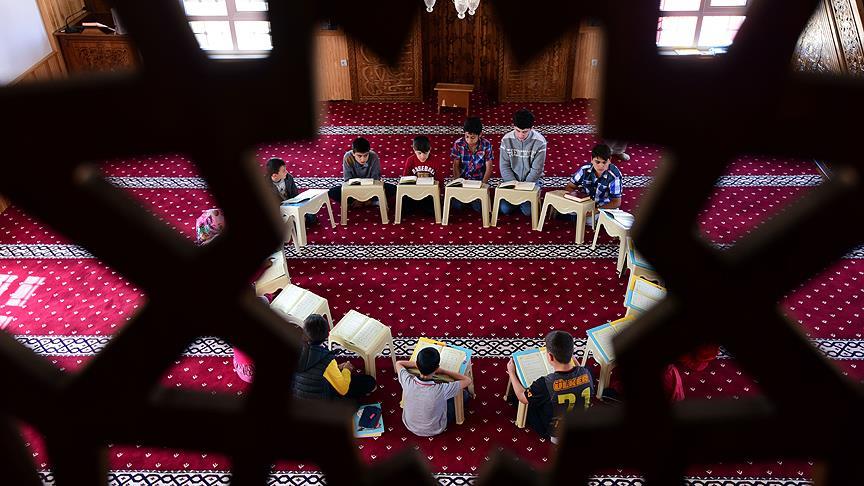 Kurslara ilgi gösteren çocuklar, Tunus Mahallesi TOKİ Camii İmamı Ayhan Kaya'dan Kur'an-ı Kerim eğitimi alıyor.