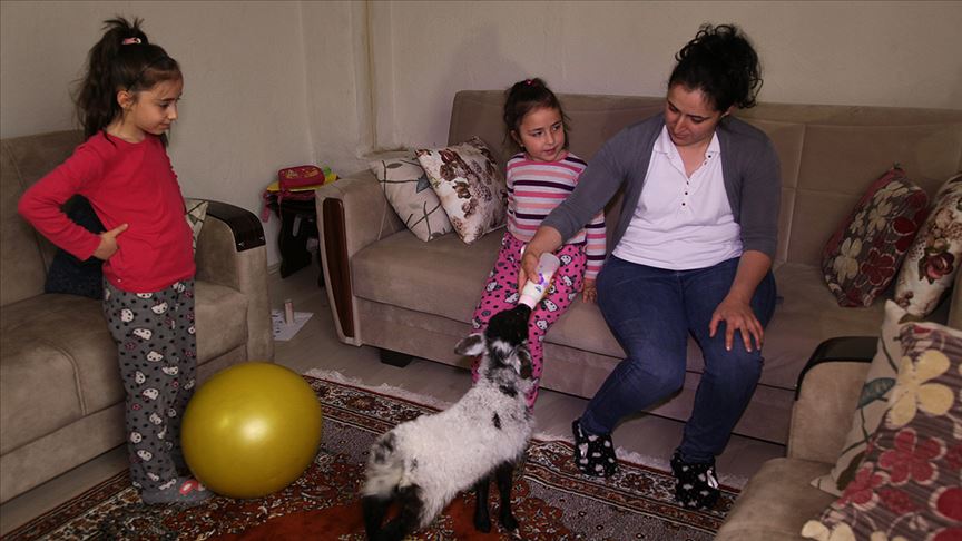 Annesinin emzirmediği kuzu evde biberonla besleniyor