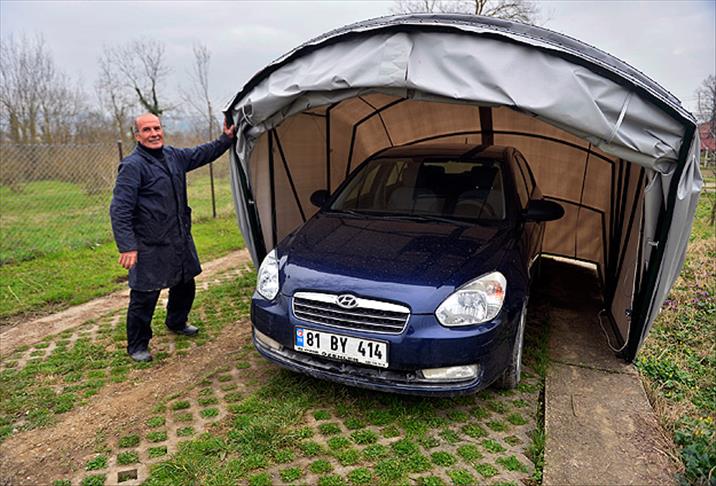Aracını korumak için "portatif çadır garaj" üretti