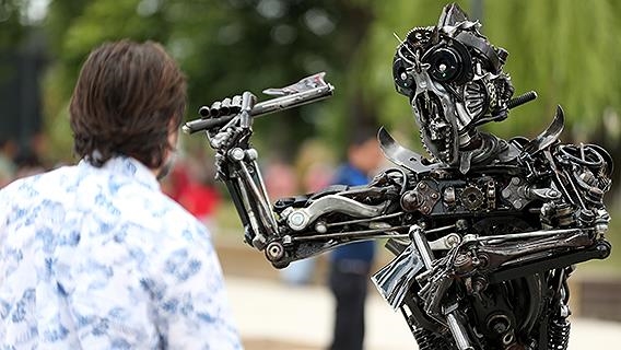 Tamire gelen araçların arızalı olduğu gerekçesiyle kullanılmayan parçalarını biriktiren Murat Çetin, onları değerlendirmek amacıyla birleştirerek 250 kilogramlık dev heykeller yaptı.