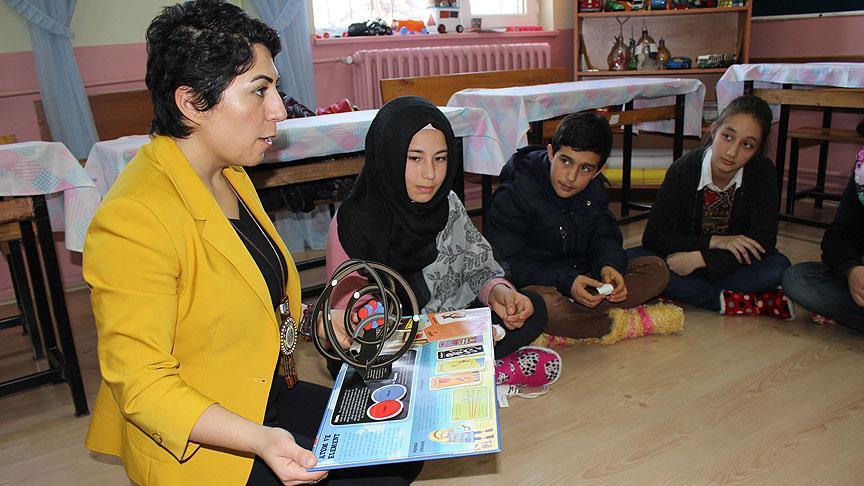 Niğde'nin Kırkpınar köyündeki ortaokulda oluşturulan "Alternatif Fen Bilimleri Sınıfı"na ayakkabısız giren öğrenciler, kimi zaman dersi minderlerde oturarak dinliyor.