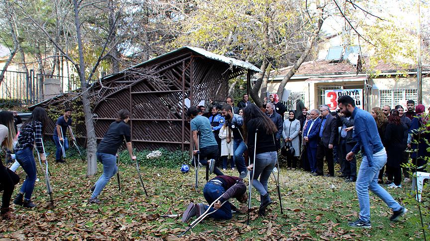 Niğde'de üniversite öğrencileri, 3 Aralık Dünya Engelliler Günü etkinlikleri kapsamında ayaklarını bağlayıp koltuk değnekleriyle futbol maçı yaptı.