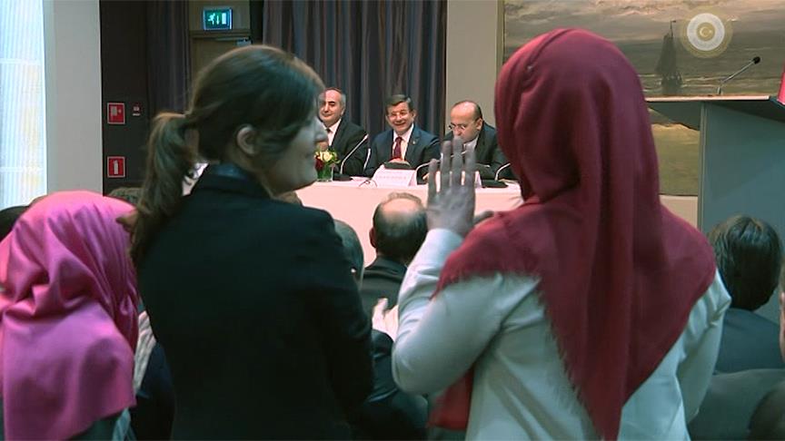 Davutoğlu'nun, Hollanda'nın Lahey kentinde, Türk toplumu temsilcileriyle bir araya geldiği programda, işitme engelli genç bir kıza, yanındaki arkadaşı Davutoğlu'nun konuşmasını işaret diliyle anlattı.