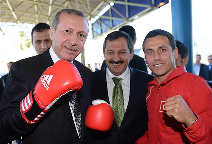 Boks eldivenlerini takan ve kısaca bilgi alan Erdoğan, daha sonra eldivenlerle poz verdi.