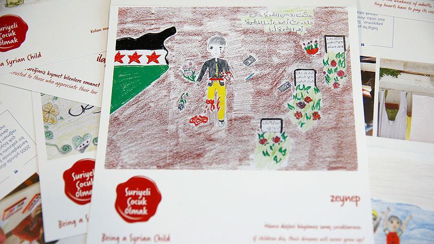 Küçük yaşta savaşla tanışan, minik bedenlerinde savaşın izlerini taşıyan Suriyeli çocuklar, yaşadıkları dramları kağıtlara resim olarak aktardı. Kimisi evlerinin bombalandığını, kimisi bacağının koptuğunu, kimisi annesinin, babasının, kardeşlerinin feryadını çizdi bu kağıtlara.