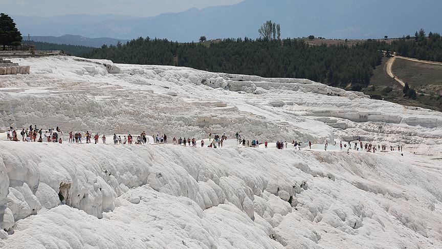 Uzakdoğulu turistlerin kültürel gezileri tercih etmelerinden dolayı son zamanlarda Çinli misafirlerin yoğunluk kazandığı Pamukkale'nin ziyaretçileri, tarihi sütunların bulunduğu antik havuzda yüzerken, beyaz travertenlerde "bulut üzerinde yürüyormuşçasına" hoş vakit geçiriyor.
