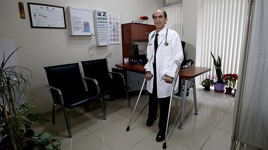İzmir'de, yaşadığı zorluklara rağmen pes etmeyen bedensel engelli doktor Hamit Topugil, çocukluk hayali beyaz önlüğüyle 27 yıldır hastalara şifa dağıtıyor.