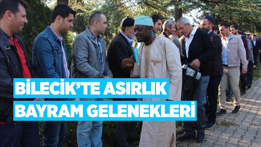 Bilecik'te dini bayramlarda asırlardır sürdürülen gelenek çerçevesinde bayram namazı sonrası cemaat, topluca mezarlık ziyaretinde bulunuyor, kadınlar da pişirdikleri bazlamaları dağıtıyor.