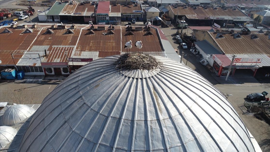 Havanın soğumaya başlamasıyla göç etmesi beklenen leyleklerden 2'si, Simani Mahallesi'nde bulunan Sanayi Sitesi Camisi'nin kubbesindeki yuvalarından çetin kış koşullarına rağmen 4 yıldır ayrılmadı.
