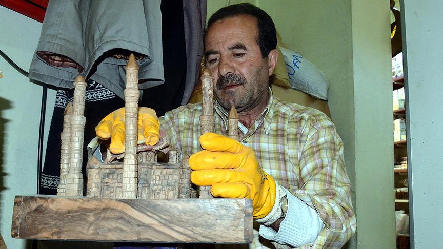 Bitlisli esnaf Enver Ünaldı, bir metrekarelik alanda yaklaşık 700 yıllık ceviz ağaçlarından kentin tarihi mekanlarının maketini yapıyor.