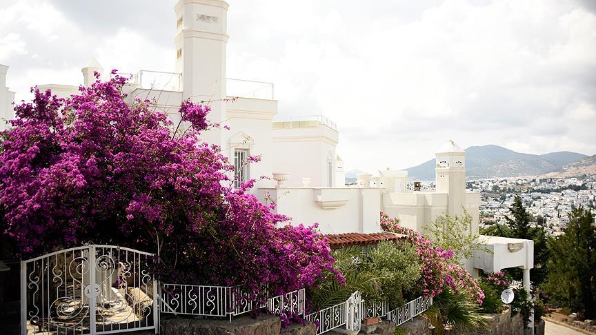 Bodrum ilçesindeki beyaz evleri sarıp sarmalayan farklı renklerdeki begonvil çiçekleri, turistik ilçeye ayrı bir güzellik katıyor.