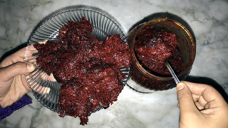 "Reçel yapmak için kırmızı acıbiberler makineyle çekiliyor ve 3-4 gün güneşte bekletiliyor. Bu süreçte de bol bol karıştırılıyor. İçindeki su alındıktan sonra olgunlaşıyor ve ortaya reçel çıkıyor. Tabii ki reçelin yapımı isottan daha zor çünkü daha uzun bir süre gerekiyor. Bu yıl reçelin kilogramı piyasada 20 liradan satılıyor. Kentte tonlarca reçel yapılıyor. Türkiye'nin birçok iline bu salçadan gönderiyoruz. Şehir dışında da insanlar artık bu reçeli biliyor.