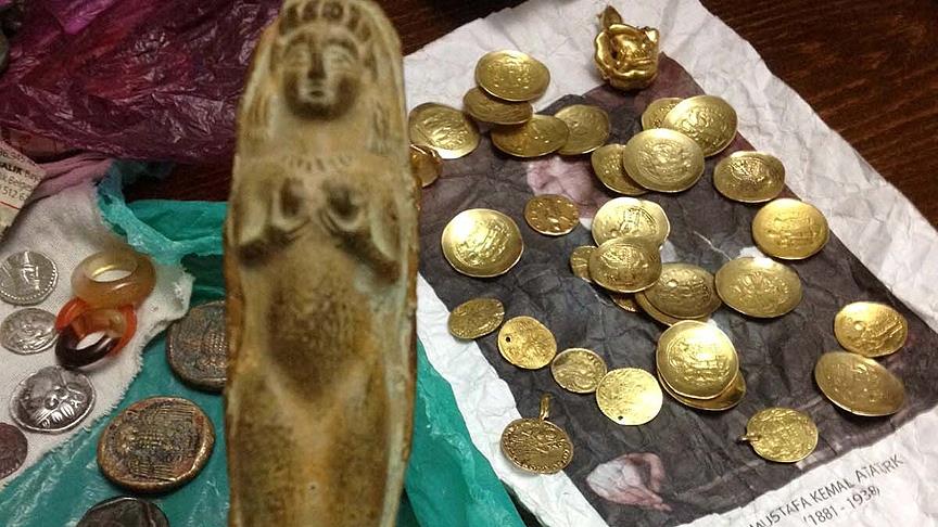 Bir evde arama yapan güvenlik güçleri, içerisinde yün bulunan çuvalda Bizans, Selçuklu ve Osmanlı dönemine ait 103 parça tarihi eser buldu.