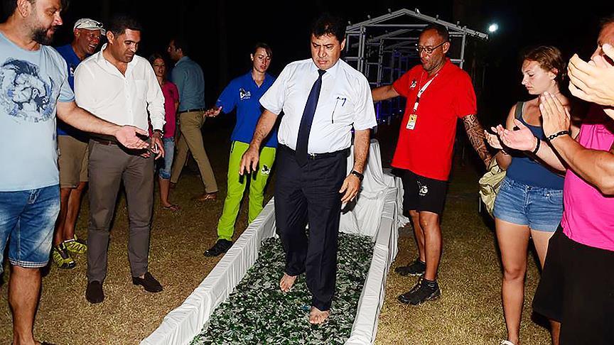 Bu arada, katılımcılar arasında bulunan engelli bir Alman turist ise diğer katılımcıların desteğiyle cam kırıkları üzerinde yürüyerek diğer katılımcıların takdirini topladı.