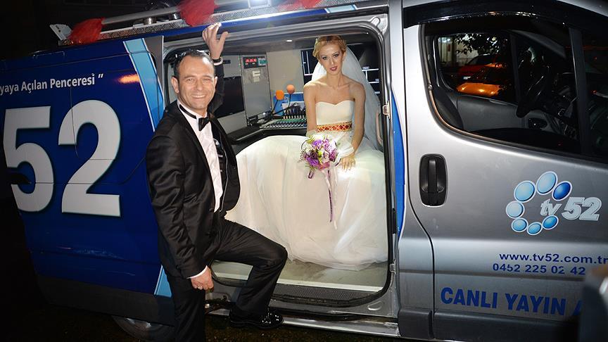 Ordu'da uydudan yayın yapan TV 52'nin haber müdürü Muzaffer Şensoy, hayatını birleştireceği Seran Eren'e sürpriz yaparak canlı yayın aracını gelin arabası olarak süsledi.