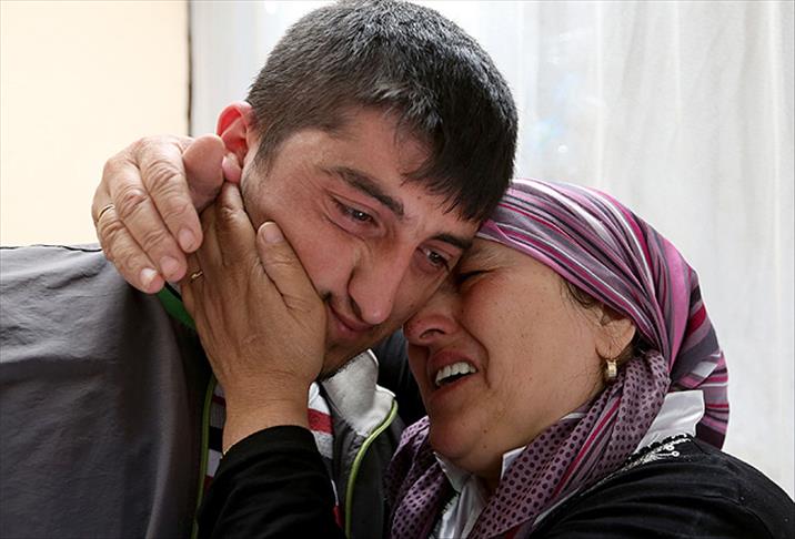 Hayata dönüş hikayesini AA çalışanlarına anlatan genç madenci ile annesi ve eşi Merve Bağdatlı objektiflere "mutluluk pozu" verdi.