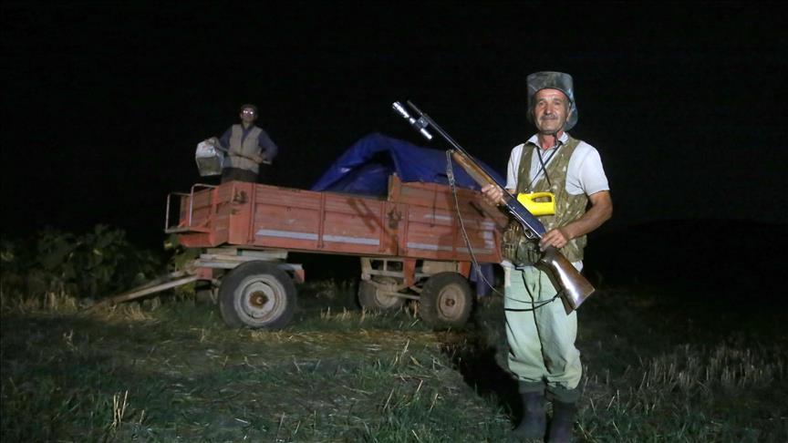 Ayçiçeği tarlalarındaki hasada kısa bir süre kalan Tekirdağlı çiftçiler, yaban hayvanlarının ürünlerine zarar vermemesi için hasat öncesi ellerinde silahları, yanlarında köpekleri ve maytaplarla arazilerinde sabaha kadar nöbet tutuyor.