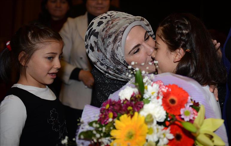 Konuşmasının ardından Çocuk Evleri'nde kalan iki kız çocuğu Emine Erdoğan'a çiçek verdi.