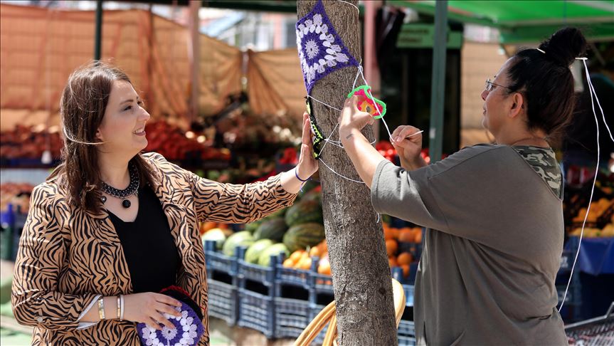 Mersin'de ördüğü binlerce atkı ve bereyi sokaktaki çocuklara hediye eden Ferda Yertut, gelecek kış da çocuklara daha fazla atkı bere dağıtmak amacıyla, kendisine yün bağışında bulunan işletmelerin sokaklarındaki ağaç ve direkleri rengarenk el örgüleriyle süslüyor.