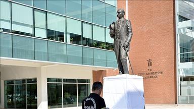 Çocuklar, sandalyede oturan Atatürk'ü yansıtan heykeli okşayıp elini öperek sevgilerini gösterdi.