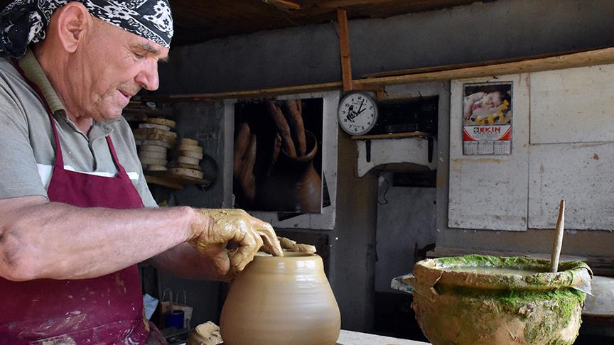 Bilecik'in Pazaryeri ilçesine bağlı Kınık köyünde yaşayan 74 yaşındaki çömlek ustası Salim Yaşar, elleriyle yoğurup şekillendirdiği toprak vazo, biblo, su testisi ve tarihi kişilerin portrelerini yapıyor.