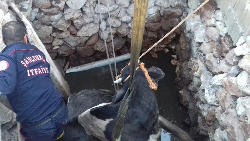 Mahalle sakinlerinin çabasına rağmen düştüğü çukurdan çıkarılamayan inek için Şanlıurfa Büyükşehir Belediyesi itfaiye ekiplerinden yardım istendi.