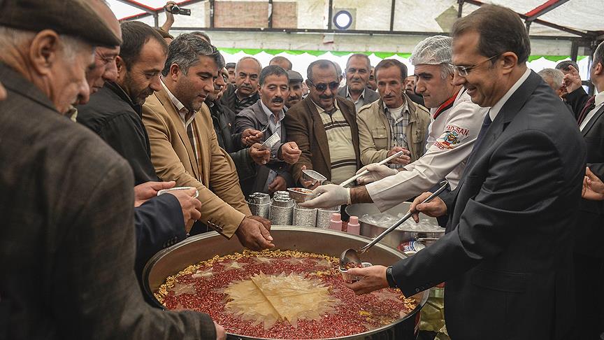 Cumhurbaşkanlığı Genel Sekreteri Fahri Kasırga'nın katılımıyla gerçekleştirilen aşure ikramı, üzerinde ay yıldız ile kayısı marmeladından yapılan Cumhurbaşkanlığı forsunun bulunduğu kazanlardan yapıldı.