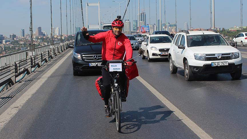 Çakmak, ay yıldızlı eşofmanı, bisikletine astığı Türk bayrağı ve "Münih-Ankara" yazısıyla vatandaşların dikkatini çekerken, araçlarıyla yoldan geçen birçok İstanbullu da klakson çalarak, kendisine destek verdi.