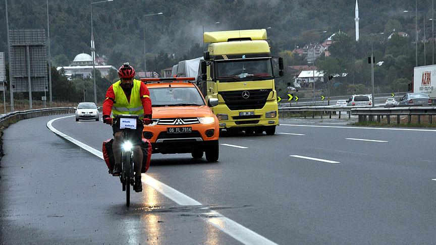 Tünelin Bolu tarafında tekrar bisikletine binen Çakmak, yoluna karayolları ekibinin eskortluğunda devam etti.