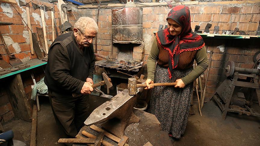 Yöndem çifti, 20 metrekarelik dükkanlarında demir döverek tarım aleti üretiyor.