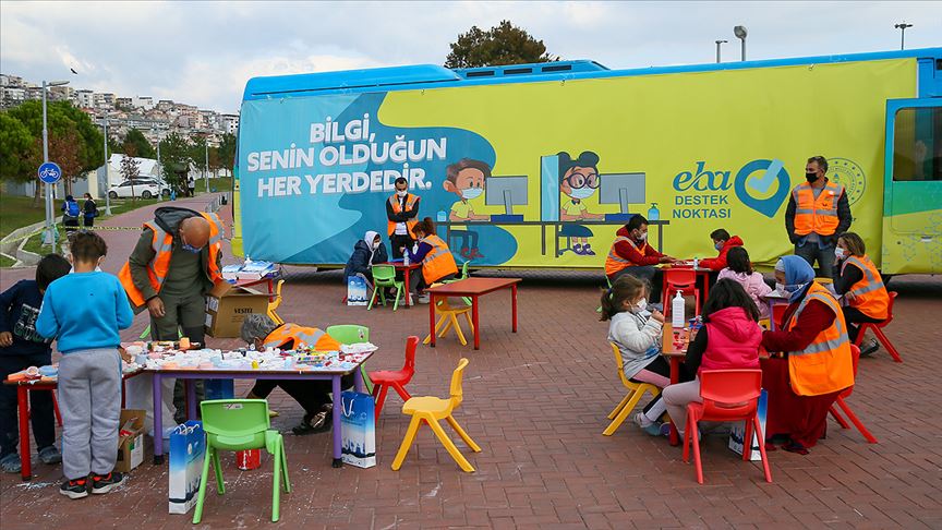 Yetkililer ayrıca alandaki Mobil Eğitim Otobüsü'nde EBA portalından yararlanma imkanı bulan çocukların çadırlarında da uzaktan eğitime devam edebilmesi için tablet dağıttı.