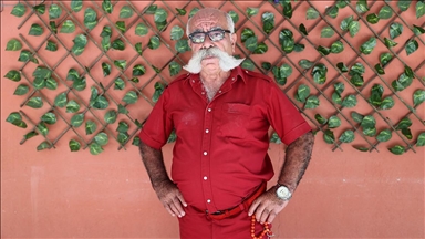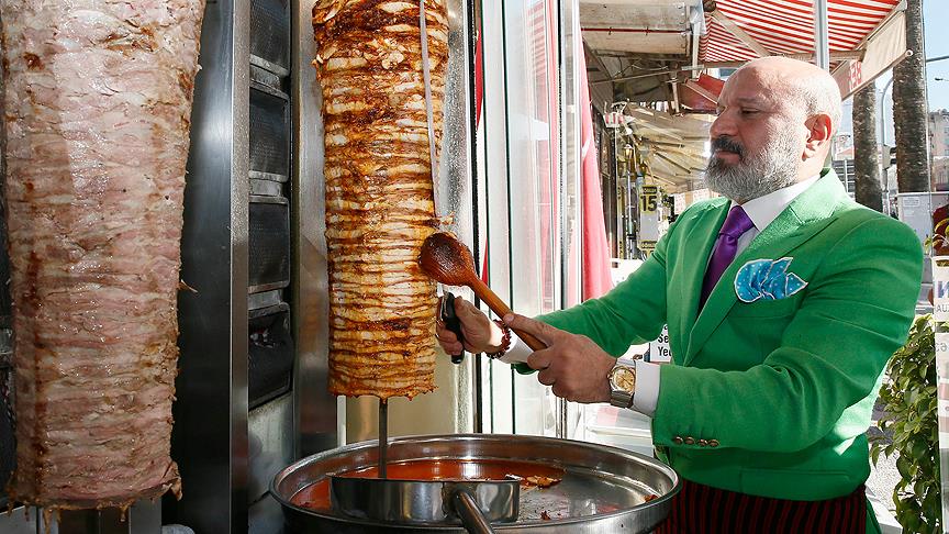 İzmir'de döner ustası Muhittin Solmuş, yıllardır kendi tasarladığı, İtalya ve İngiltere'den getirttiği özel kumaşlardan diktirdiği rengarenk kıyafetleri ile müşterilerinin ilgisini çekiyor.