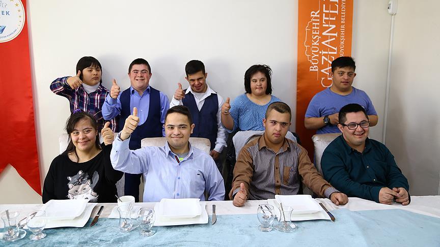 Gaziantep Büyükşehir Belediyesi Sanat ve Meslek Eğitim Kursları (GASMEK) tarafından garsonluk eğitimi verilen down sendromlu gençler, açılacak Down Kafe'de garson olmak için gün sayıyor.