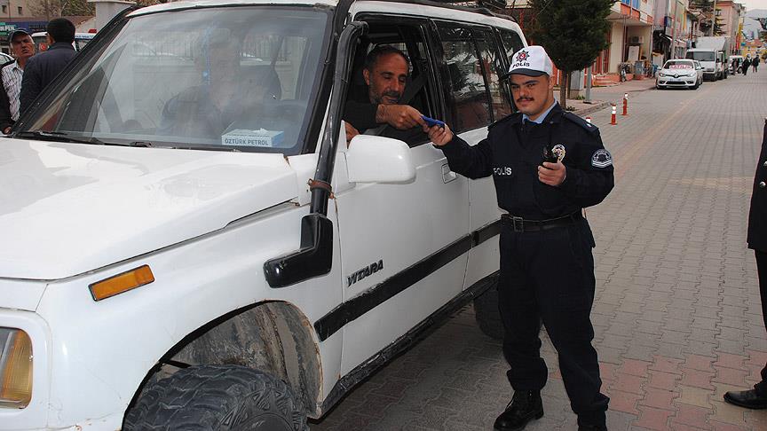 Konya'nın Sarayönü ilçesinde yaşayan down sendromlu Gökhan Taş, hayalini kurduğu polis üniformasını giyerek trafik kontrolü yaptı.