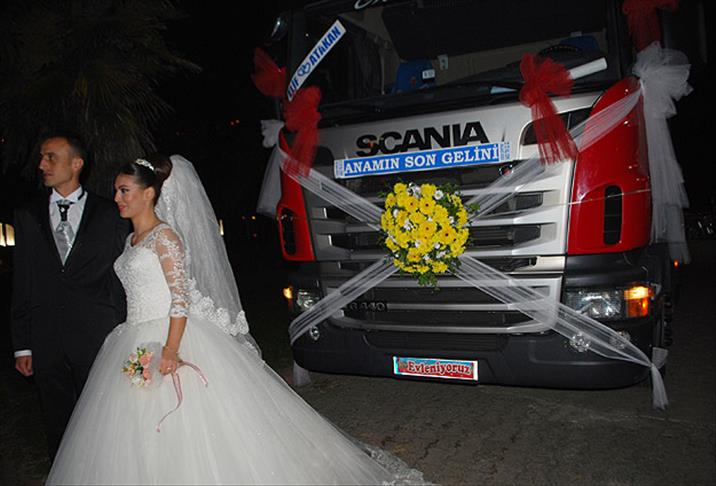 Tır şoförü damat Atakan Karaaslan ve gelin Elif Palavar çifti, gelin arabası olarak tırın çekicisini tercih etti. Renkli şeritler ve çiçeklerle süslenen çekicinin direksiyonuna geçen Karaaslan, kendisine eşlik eden arkadaşlarının kullandığı 20 çekiciyle konvoy halinde ilçenin cadde ve sokaklarını turladı.