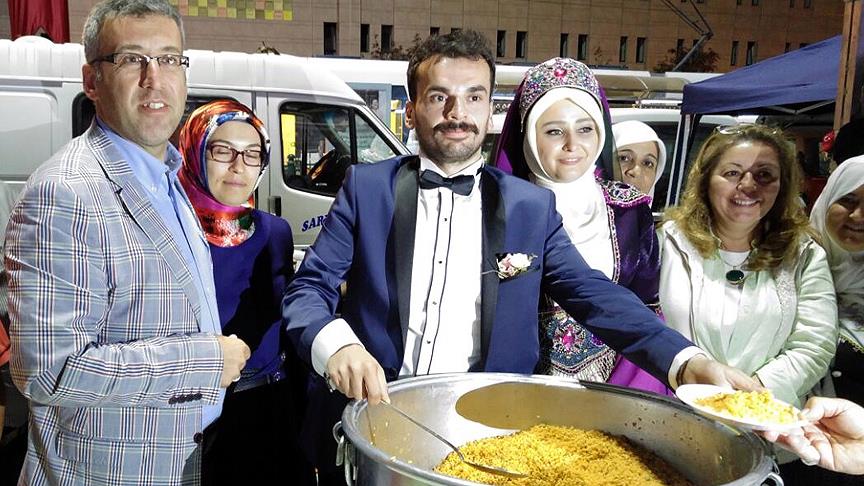 Daha sonra yeni evli çift, Sarıcakaya Belediyesi standına geçerek, demokrasi nöbeti tutan binlerce kişiye Osmanlı aşı dağıttı.